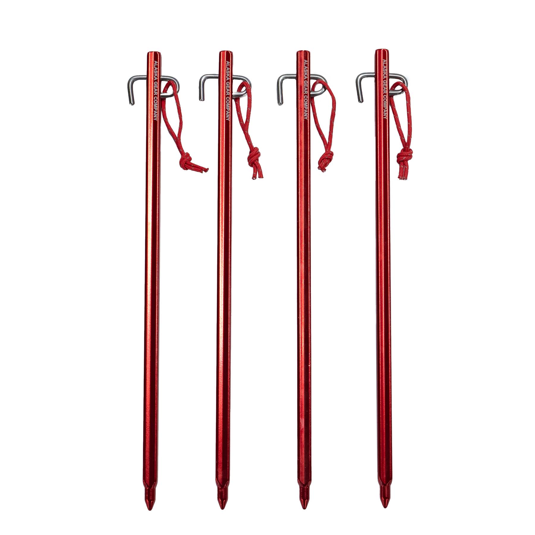 These aluminum twisted stakes are anodized red for visibility and feature a corkscrew design, which increases their holding power and structural integrity while keeping them lightweight.