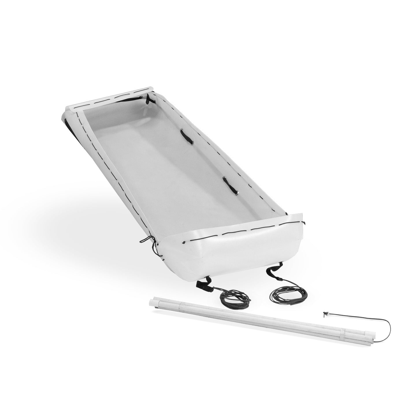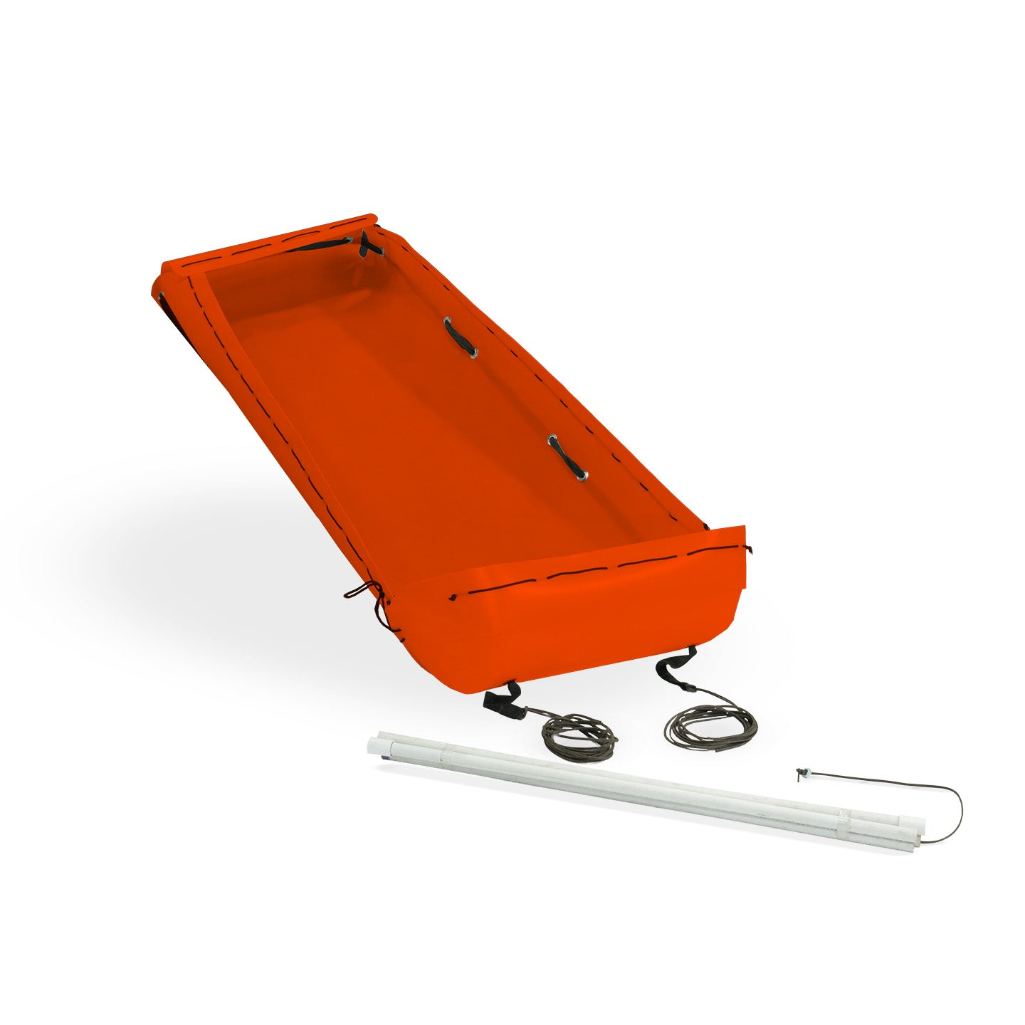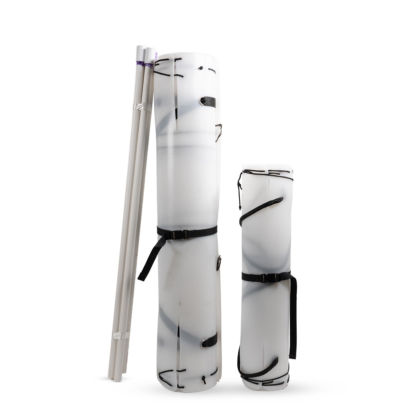 The backcountry roll-up flex sled comes in two model sizes, utilizing 1/16th UHMW cold crack-resistant plastic. It can be disassembled and rolled up when no longer needed. One of the advantages of the flex sled over other portable game sleds is that both of these sleds use a rocker profile, allowing for superior navigability and fewer snags and hang-ups while pulling.
