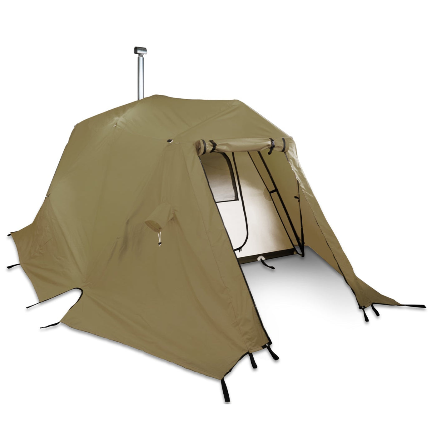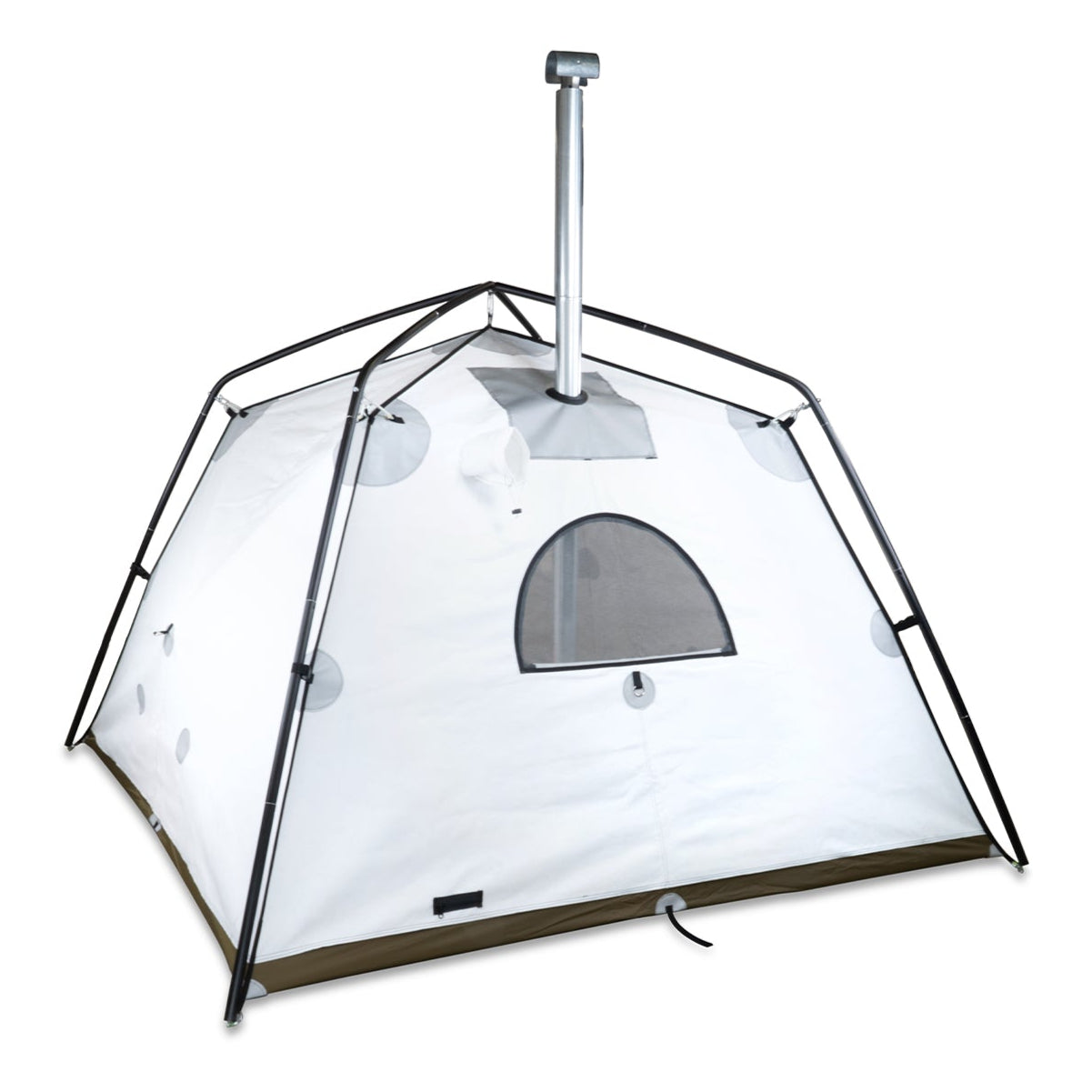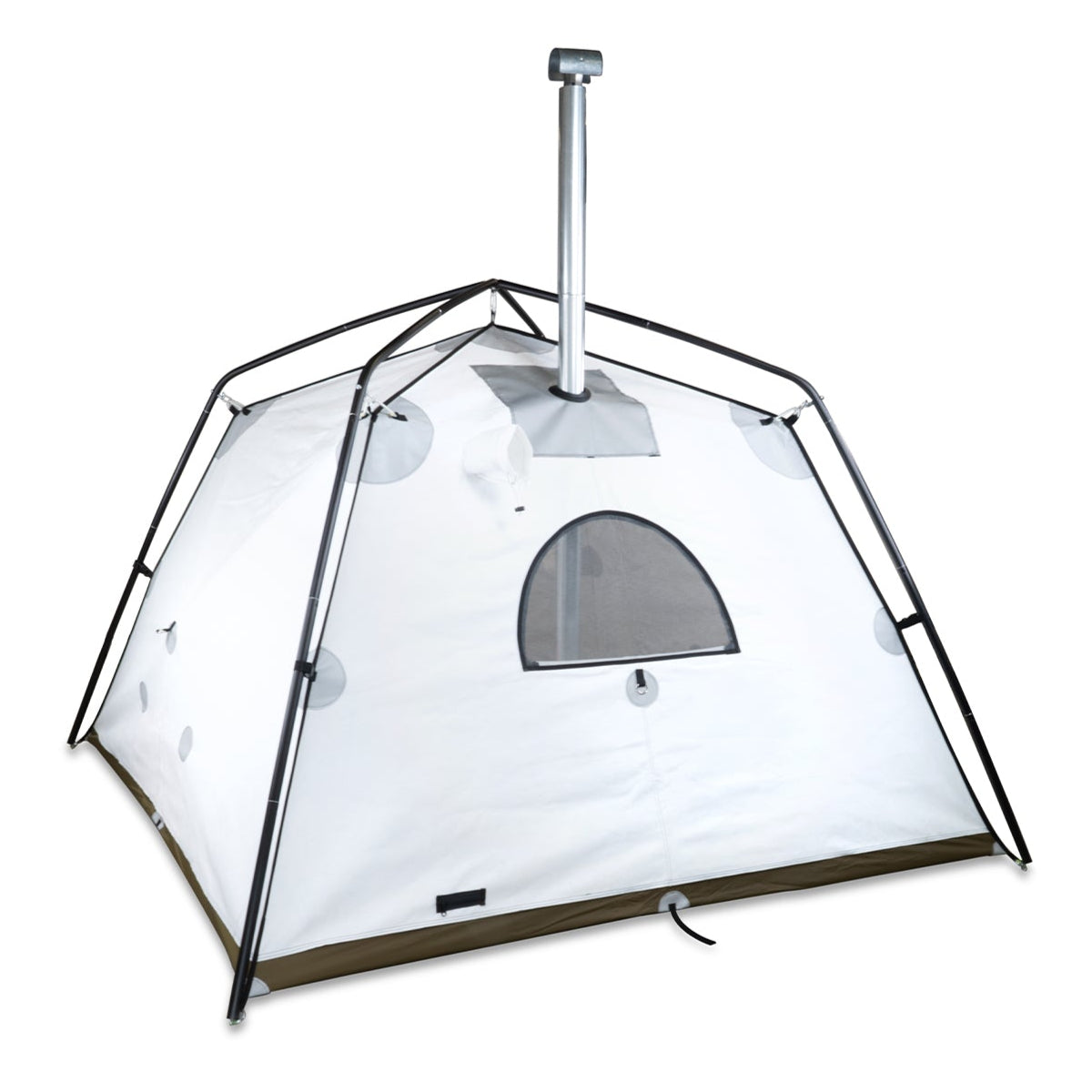Flame Resistant Materials: Built to be a hot tent the body is constructed with Vapex which exhibits a myriad of benefits one of which is flame resistance as well as a silica glass stove jack that is fireproof up to 700 degrees F.