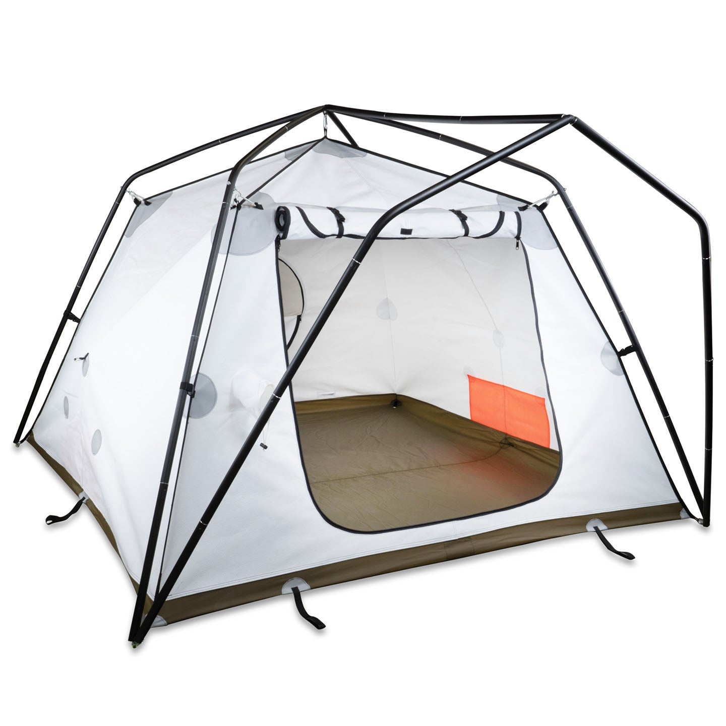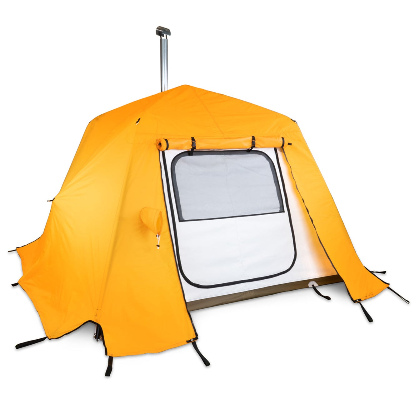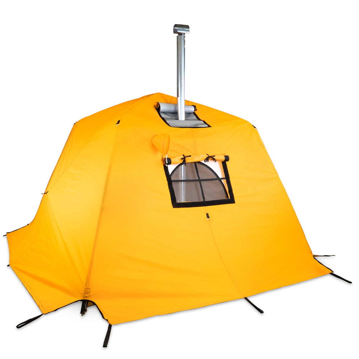 Flame Resistant Materials: Built to be a hot tent the body is constructed with Vapex which exhibits a myriad of benefits one of which is flame resistance as well as a silica glass stove jack that is fireproof up to 700 degrees F.