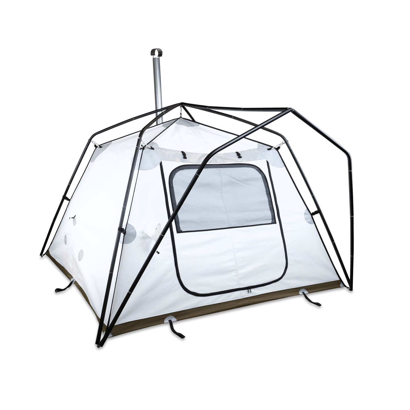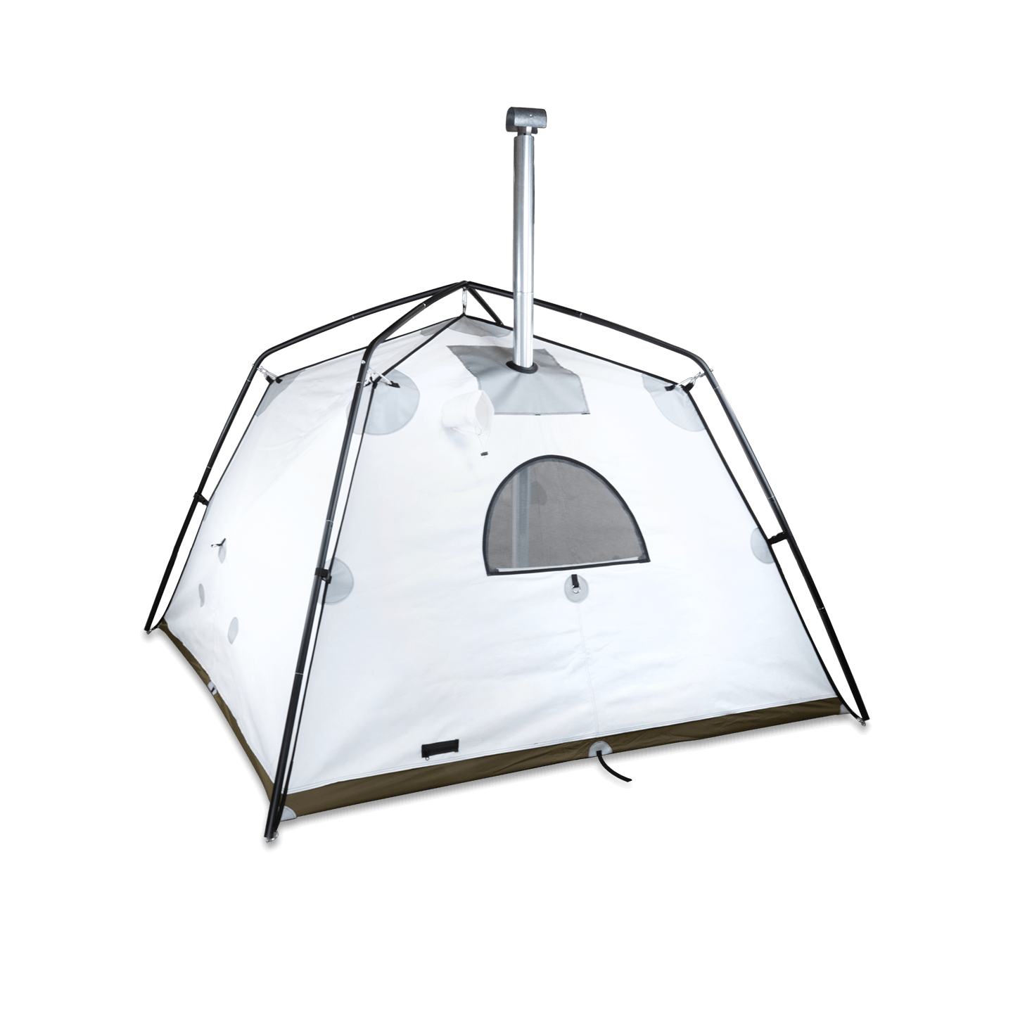 Flame Resistant Materials: Built to be a hot tent the body is constructed with Vapex which exhibits a myriad of benefits one of which is flame resistance as well as a silica glass stove jack that is fireproof up to 700 degrees F.