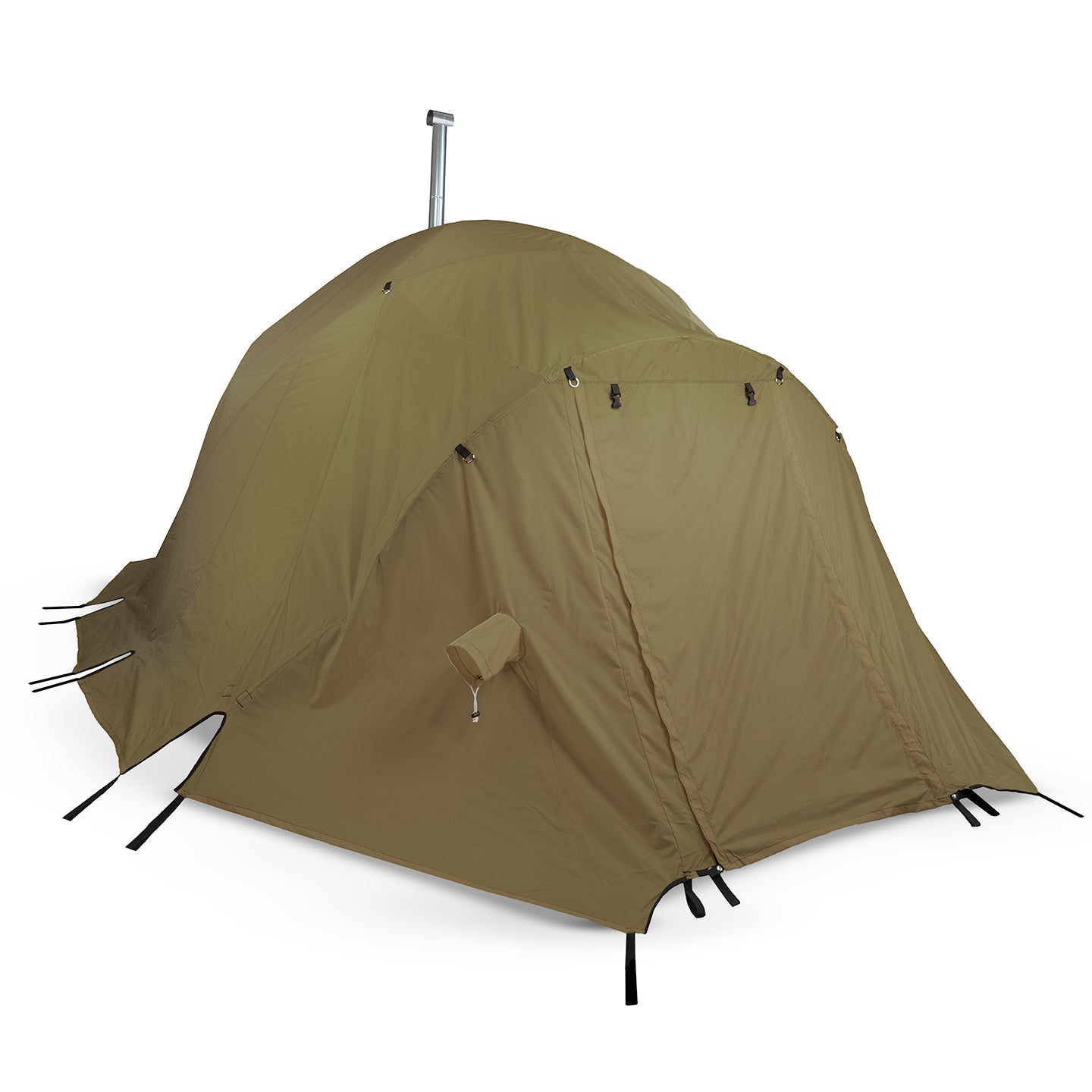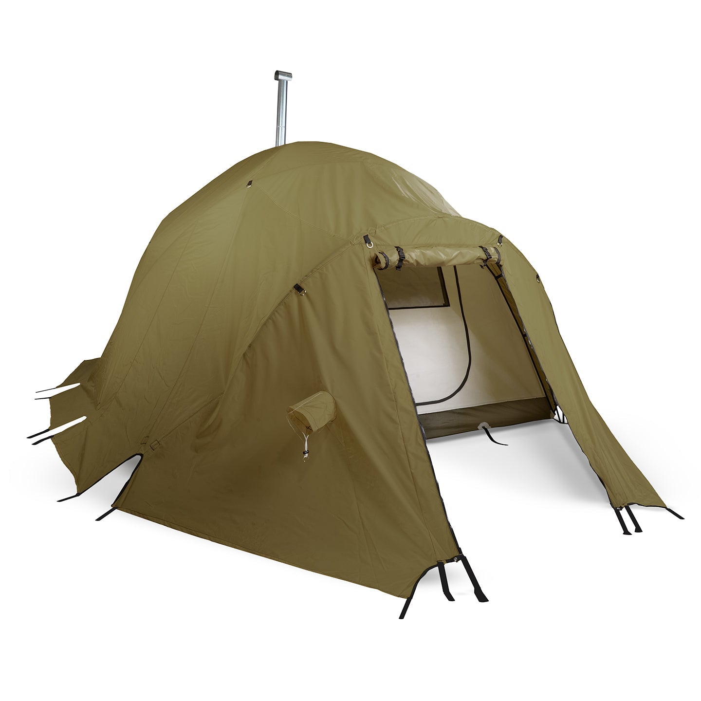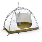 Flame Resistant Materials: Built to be a hot tent the body is constructed with Vapex which exhibits a myriad of benefits one of which is flame resistance as well as a silica glass stove jack that is fireproof up to 700 degrees F.